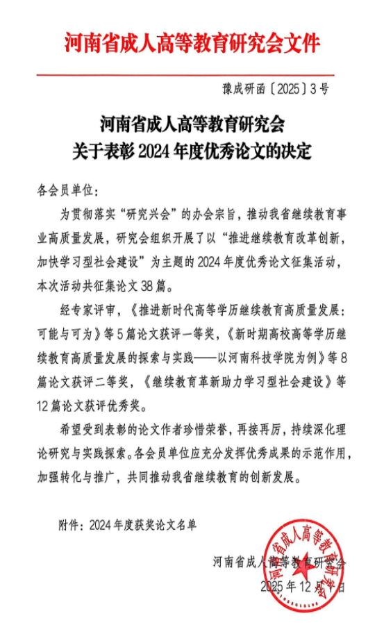 近日,河南省成人高等教育研究会公布2024年度优秀论文评选结果,我校两篇论文凭借扎实的研究功底与鲜明的实践价值脱颖而出,分获一、二等奖,充分展现学校在继续教育领域的研究实力与育人成效。