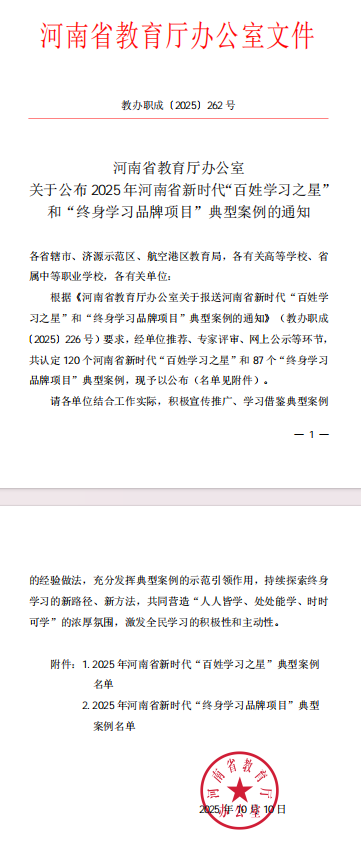 近日,河南省教育厅发布《关于公布2025年河南省新时代“百姓学习之星”和“终身学习品牌项目”典型案例的通知》(教办职成〔2025〕262号),我校共有1个河南省新时代“百姓学习之星”和1个“终身学习品牌项目”典型案例予以入选。